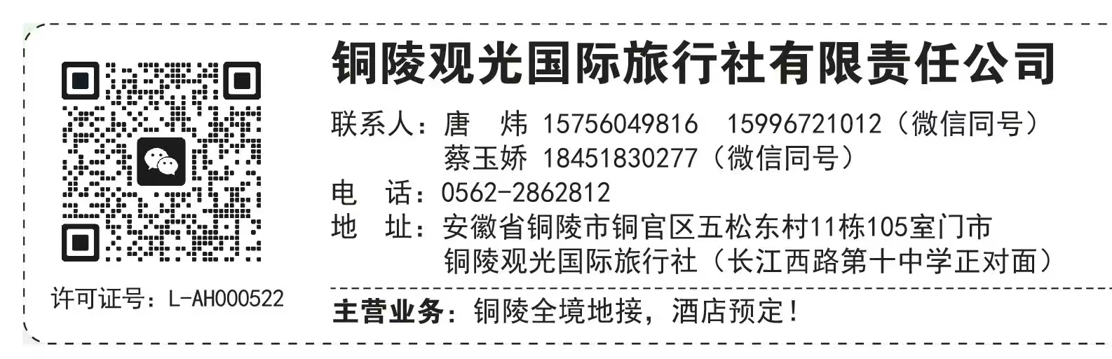 地址: 安徽省銅陵市長江西路第十中學正對面銅陵觀光國際旅行社(五松東村11棟105)